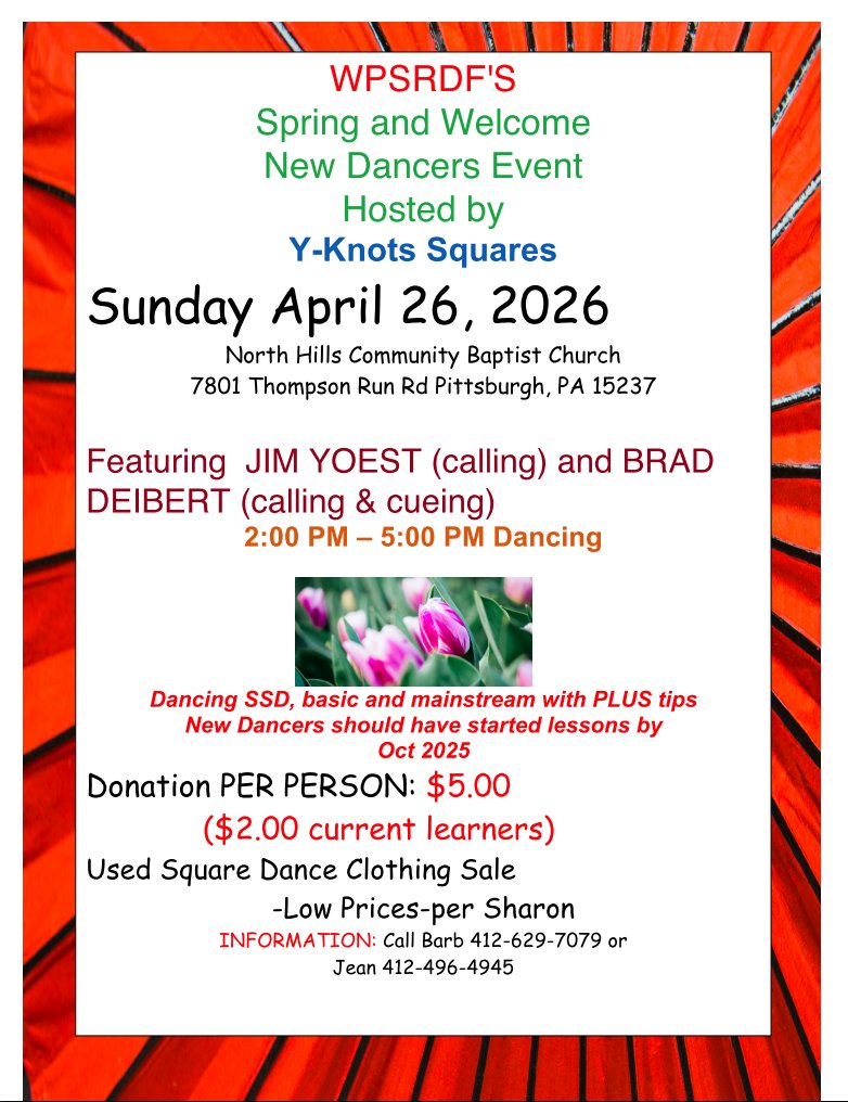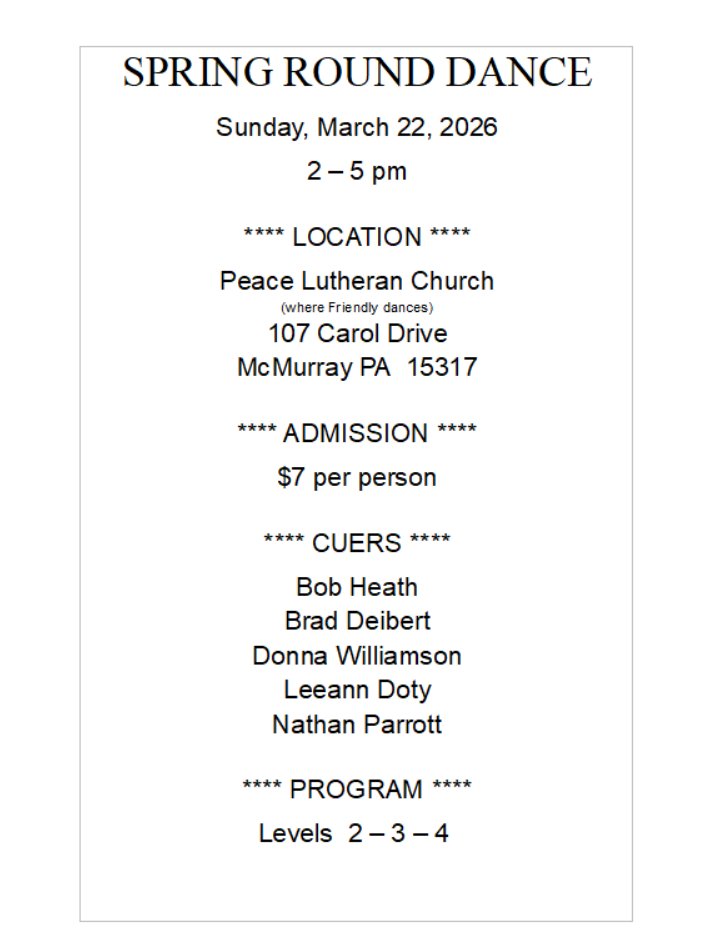 - Friendly Squares- Most Tuesdays (Rounds from 6-7 pm, Squares from 7-9 pm) at Peace Lutheran Church, 107 Carol Drive, McMurray PA. Contact Sue Hopf: 412-716-4403
